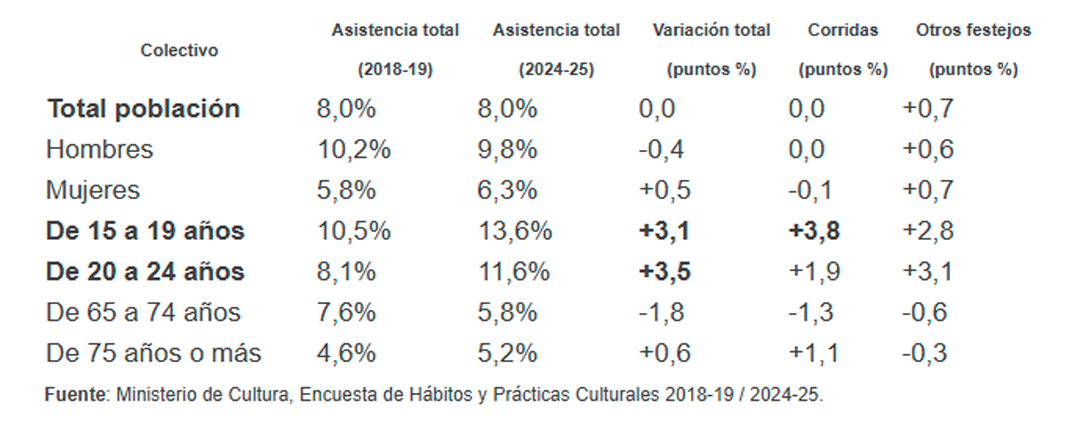 El documento muestra que la asistencia a corridas de toros entre adolescentes de 15 a 19 años ha aumentado 3,8 puntos porcentuales, coincidiendo con la inclusión de la tauromaquia dentro del Bono Cultural Joven, que otorga 400 euros a cada persona que cumple 18 años para gastar en actividades culturales.
