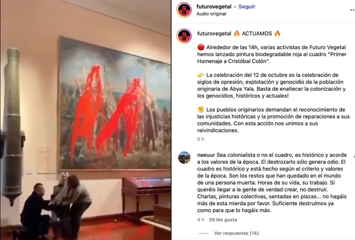 Dos activistas del colectivo de desobediencia civil Futuro Vegetal intervinieron hoy en torno a las 14.00 horas en el Museo Naval de Madrid, arrojando pintura roja biodegradable sobre el cuadro Primer homenaje a Cristóbal Colón, obra del pintor José Garnelo, ubicada en la entrada del recinto.