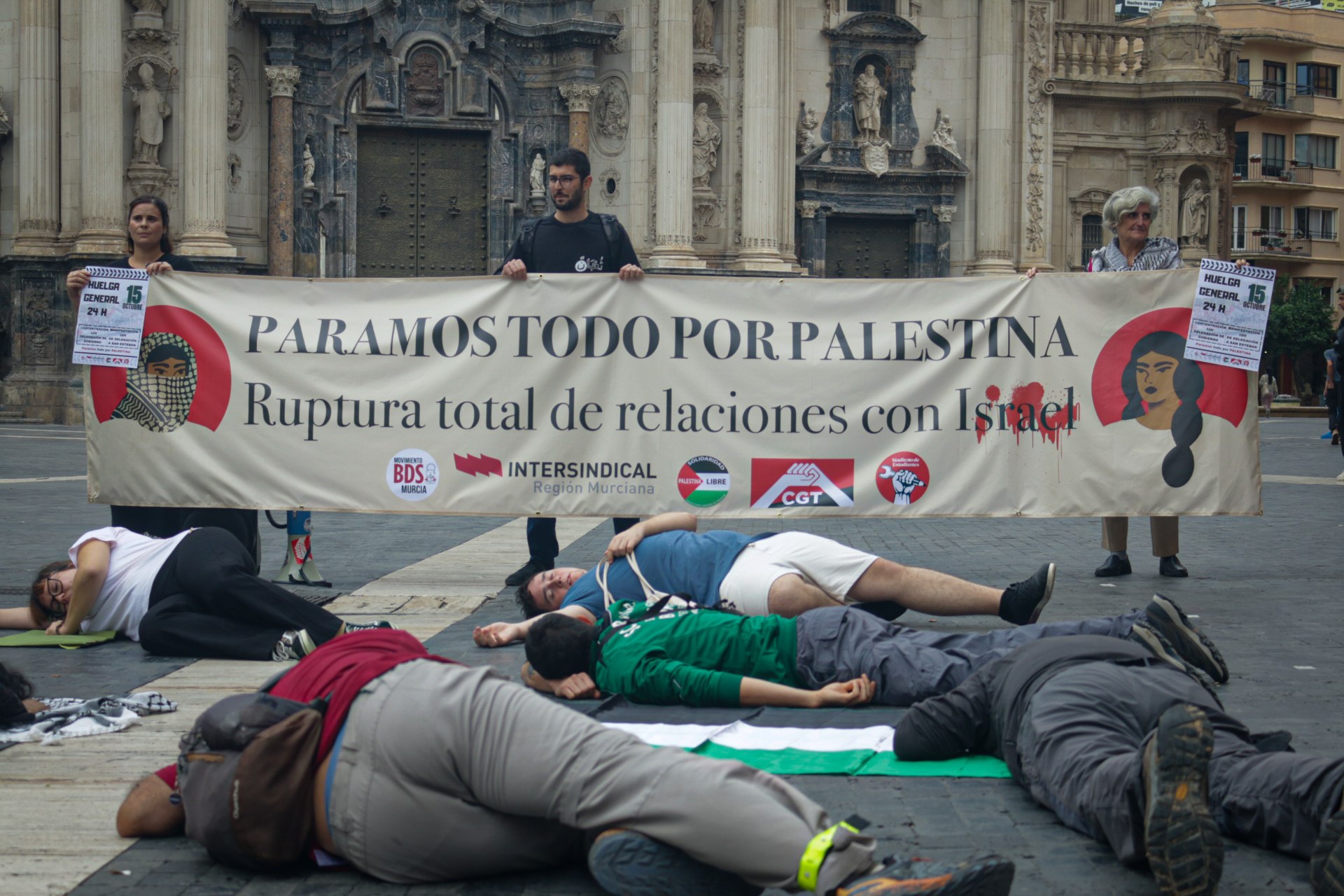 La Plaza Cardenal Belluga se ha convertido esta mañana en escenario de una acción de denuncia contra el genocidio del pueblo palestino. Una veintena de activistas sindicales y estudiantiles se han tumbado en el suelo en un “die-in”, simulando los cuerpos de las miles de personas asesinadas por Israel en Gaza, mientras desplegaban pancartas exigiendo ruptura total de relaciones con el Estado sionista.