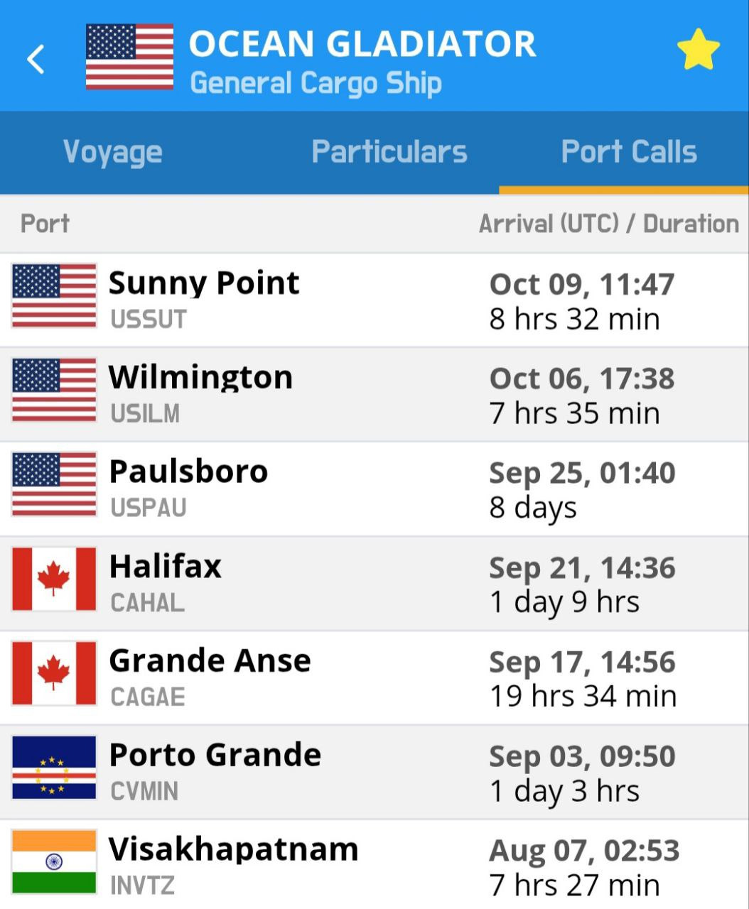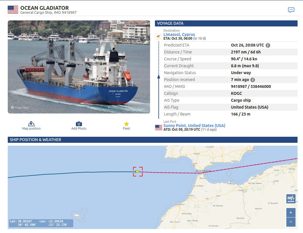 El Ocean Gladiator navega actualmente a una velocidad de 14 nudos y, según la información disponible, atravesará el Estrecho de Gibraltar y aguas territoriales españolas en las próximas horas, con llegada estimada a las 11:00 del martes 21 de octubre.