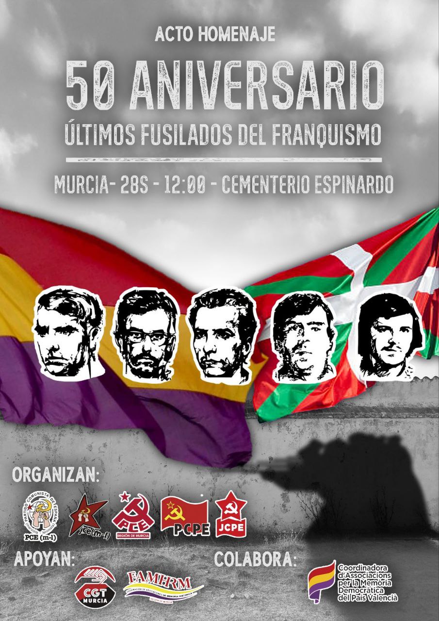 En el homenaje a los cinco fusilados que se llevó a cabo el domingo 27 de septiembre en “el cementerio grande” de Espinardo, se habló también del cincuentenario de la impunidad, puesto que solo Martín Villa, gobernador civil de Barcelona en el 74, ha sido imputado desde entonces, solo recientemente y desde Argentina.