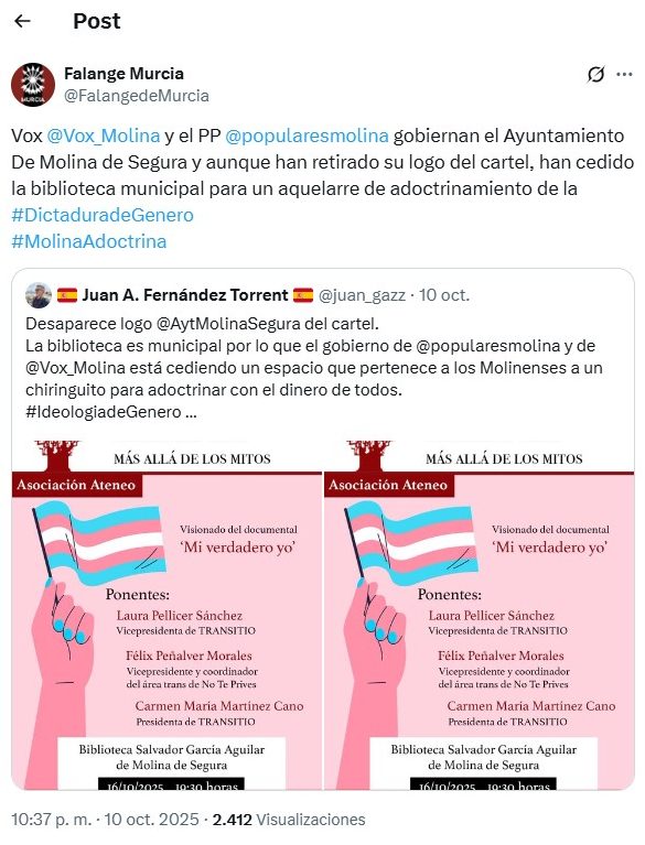 Amenazas de la Falange, presencia policial en la puerta y un intento abierto de amedrentar a un espacio cultural para impedir una charla sobre derechos trans. Lo que ocurrió en el Ateneo Cultural de Molina de Segura no fue solo un acto formativo: fue una demostración civil de que el odio puede intentar intimidar, pero no siempre consigue callar.