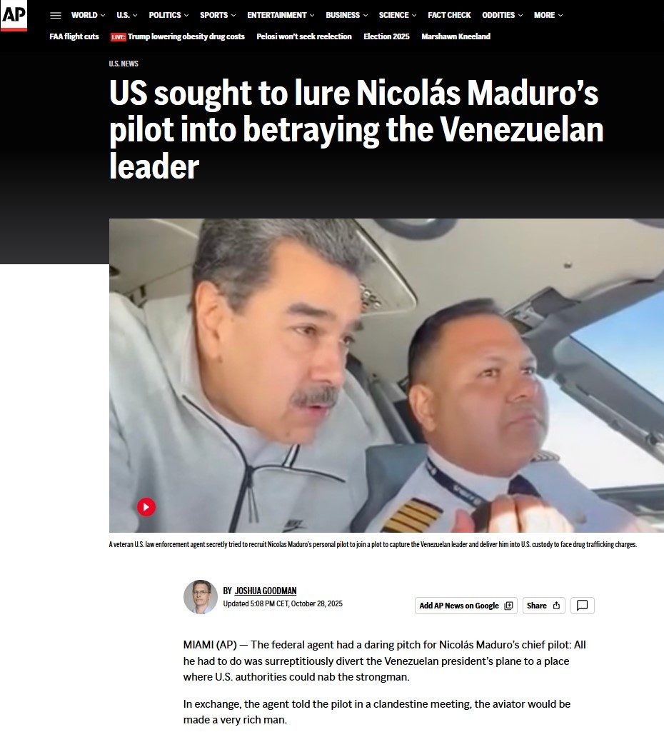 “US sought to lure Nicolás Maduro’s pilot into betraying the Venezuelan leader” – AP News. AP News: US sought to lure Nicolás Maduro’s pilot into betraying the Venezuelan leader