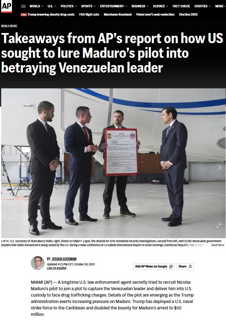 “US sought to lure Nicolás Maduro’s pilot into betraying the Venezuelan leader” – AP News. AP News: US sought to lure Nicolás Maduro’s pilot into betraying the Venezuelan leader