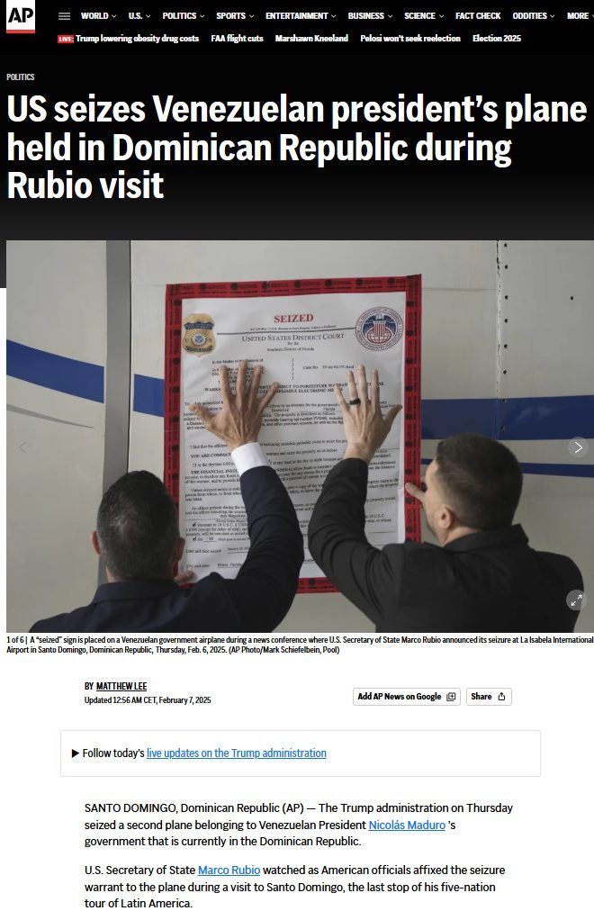 - “US seizes Venezuelan president’s plane held in Dominican Republic during Rubio visit” – AP News. AP News: US seizes Venezuelan president’s plane held in Dominican Republic during Rubio visit
