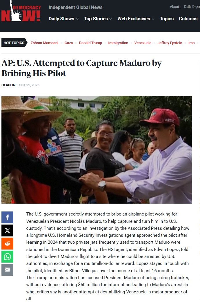 “AP: US attempted to capture Maduro by bribing his pilot” – Democracy Now!. Democracy Now!: AP: U.S. Attempted to Capture Maduro by Bribing His Pilot