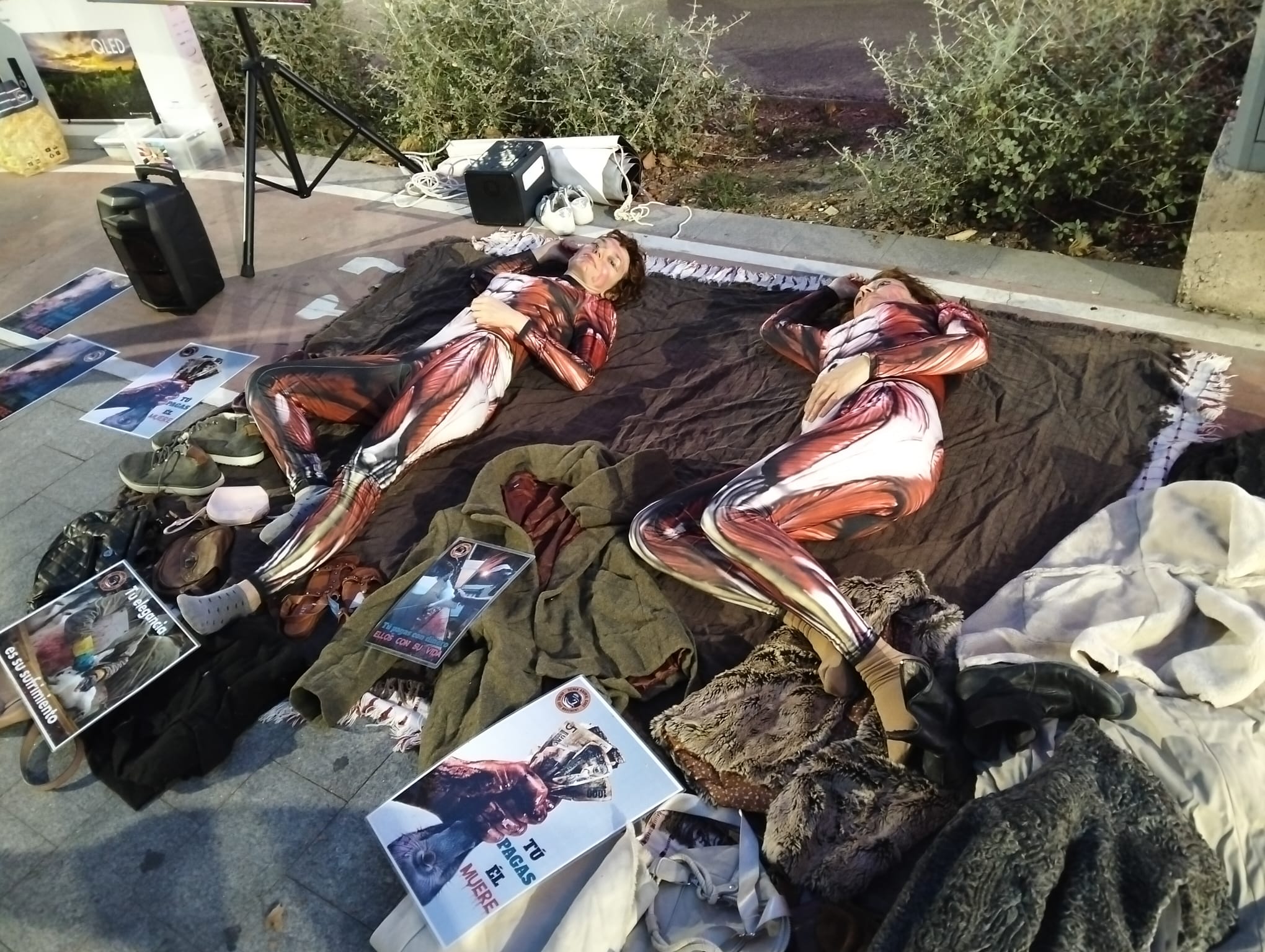 Activistas animalistas realizan una performance contra la industra peletera frente a El Corte Inglés de Alicante | Foto: Jesús Martínez