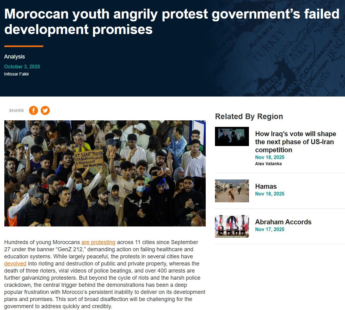 - Middle East Institute: «Moroccan youth angrily protest government’s failed development promises» (Octubre 2025). Un análisis detallado que explica cómo la industrialización y los macroproyectos en Marruecos no se han traducido en una mejora de los servicios públicos o en empleos de calidad para la juventud, creando una «brecha de credibilidad».