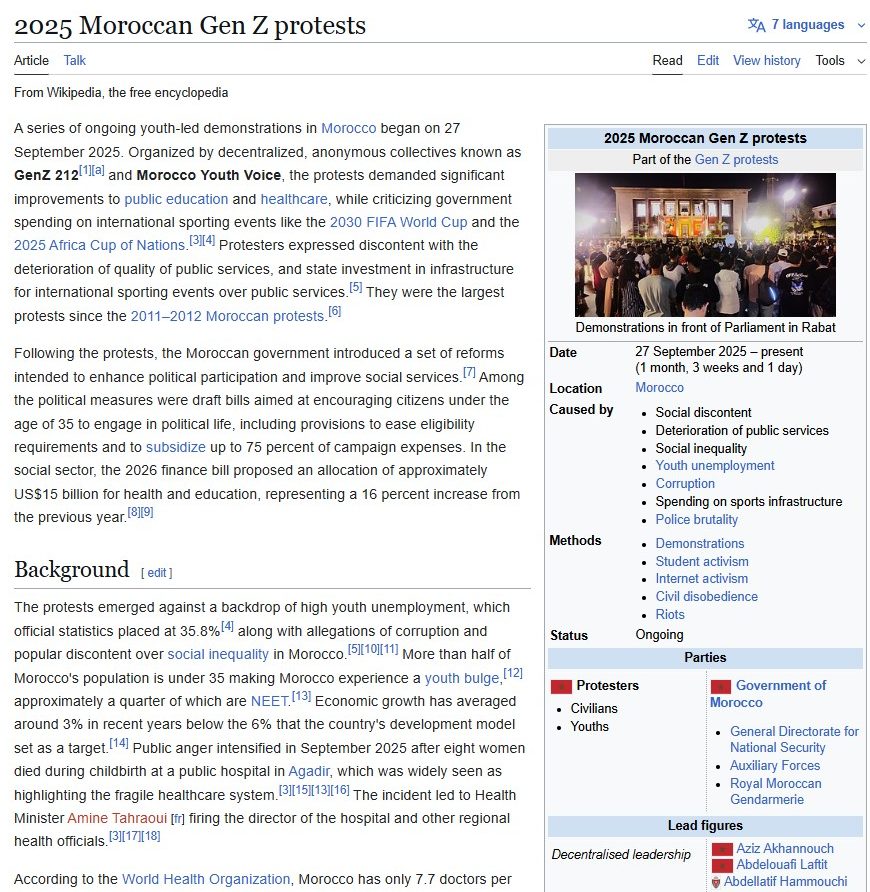 - Wikipedia: «2025 Moroccan Gen Z protests» (Actualizada hasta octubre de 2025). Ofrece una cronología y un resumen de las protestas de 2025, citando estadísticas clave como que más de una cuarta parte de los jóvenes no estudia ni trabaja (NINI), y recoge las demandas de mejoras en sanidad y educación.
