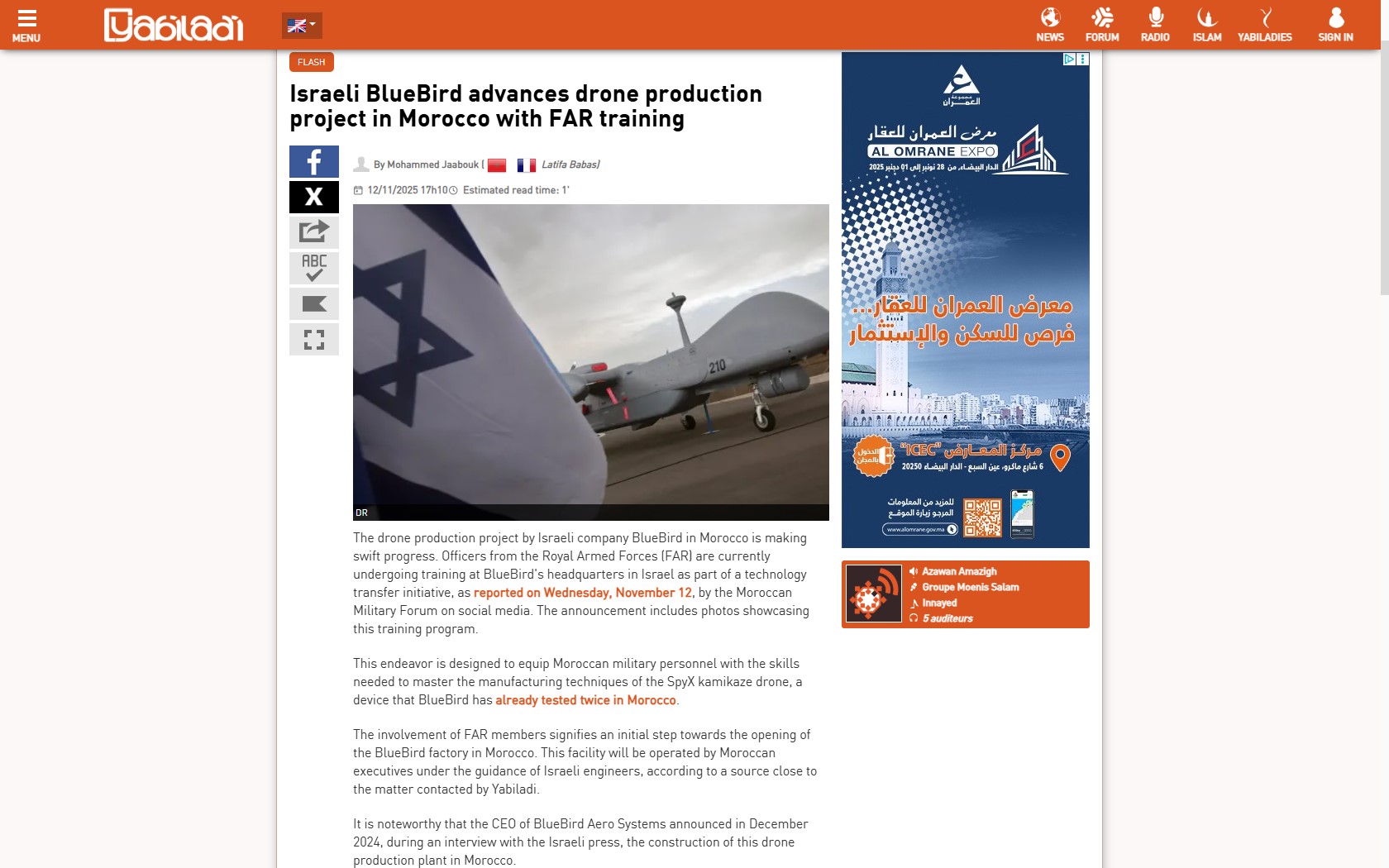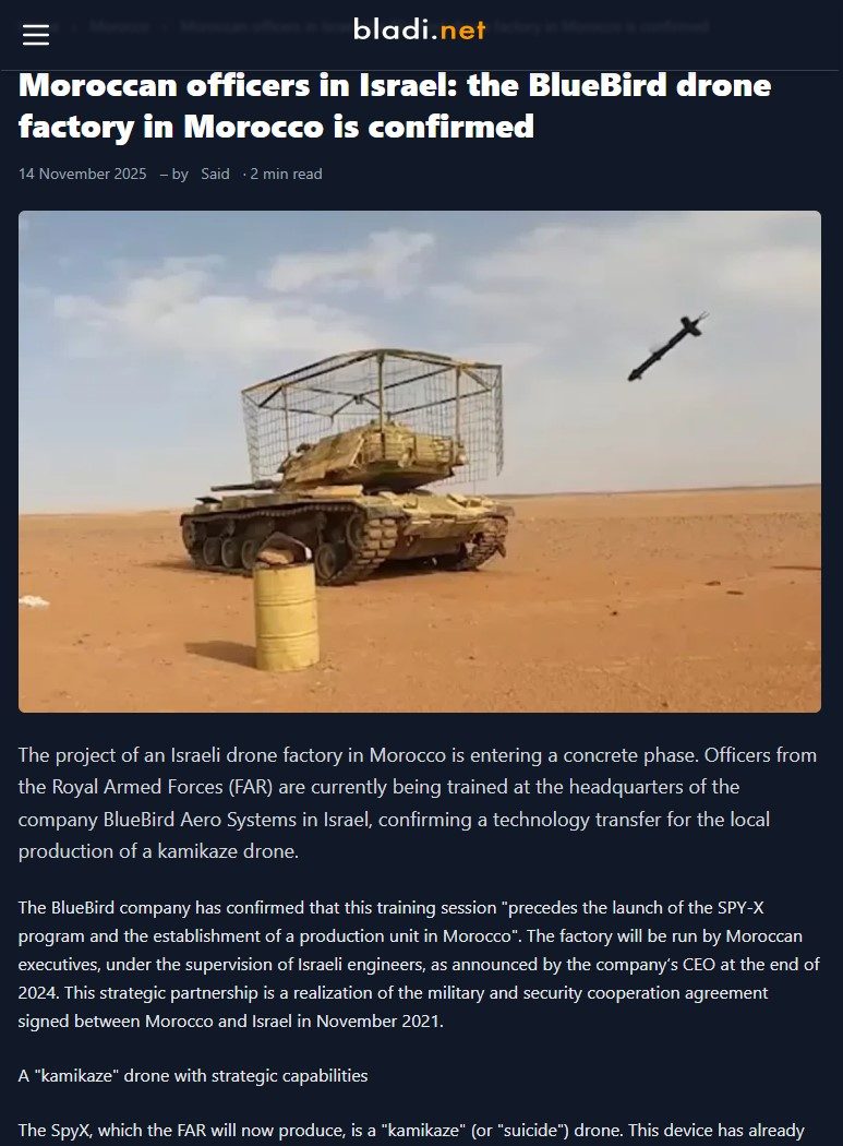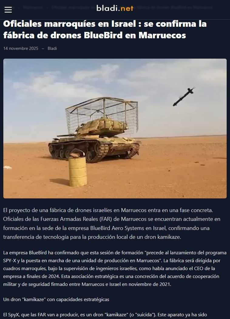 - Bladi.net: «Moroccan officers in Israel: the BlueBird drone factory in Morocco is confirmed» (14 de noviembre de 2025)
