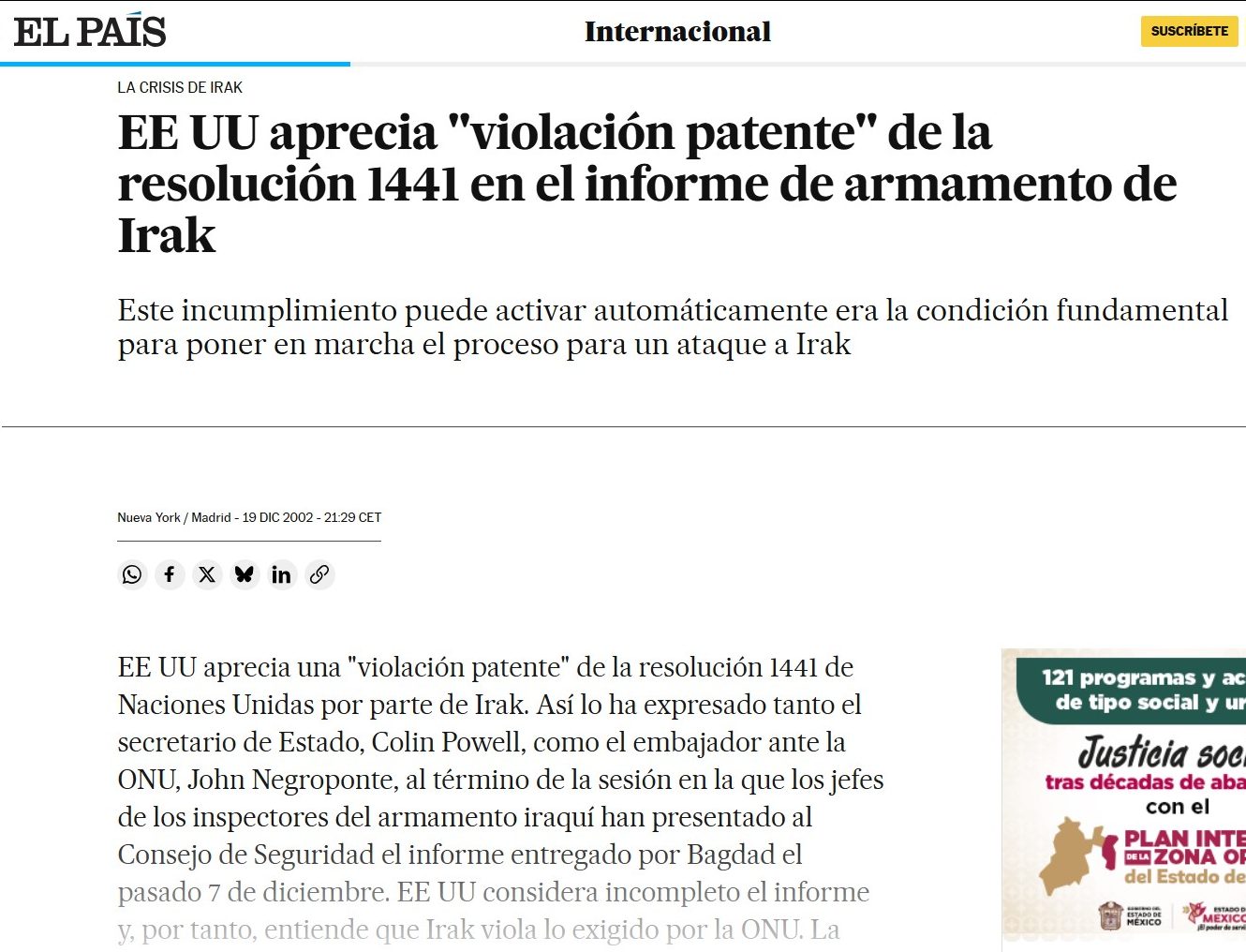 | 10 | Irak | EL PAÍS | EE UU aprecia «violación patente» de la resolución 1441 en el informe de armamento de Irak | EE UU aprecia «violación patente» de la resolución 1441 en el informe de armamento de Irak |