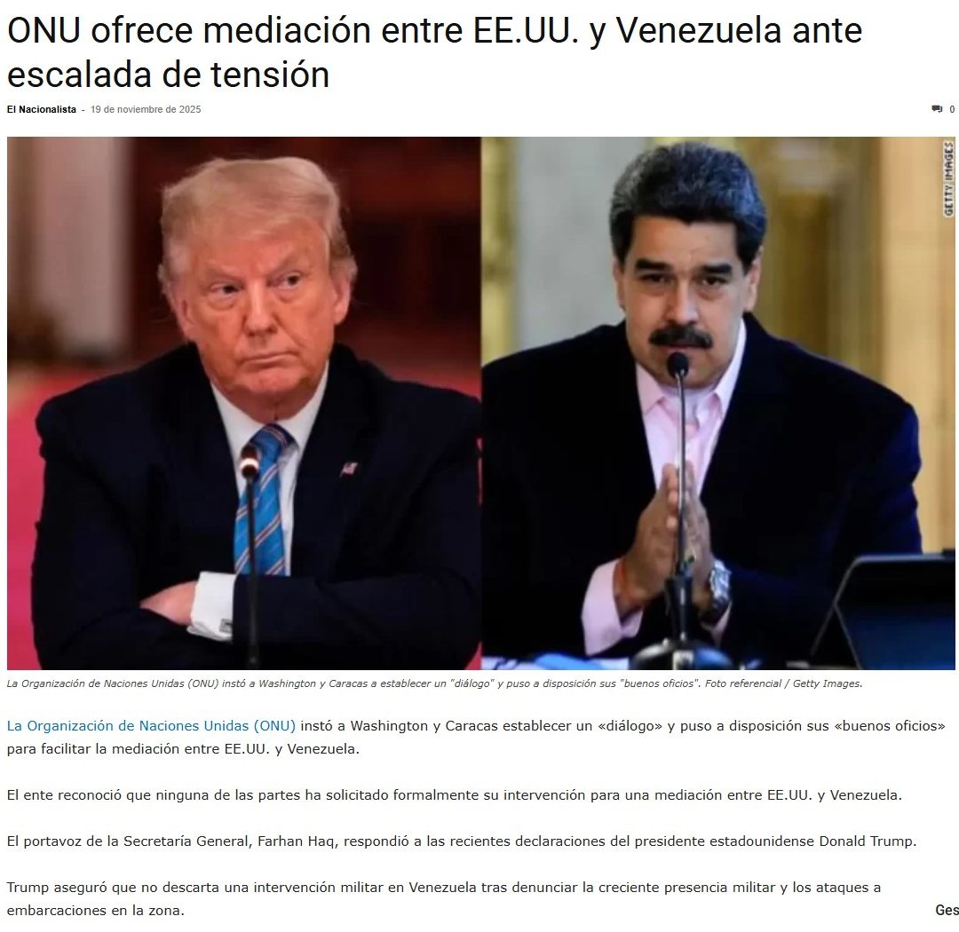 | 21 | Venezuela | ONU | ONU ofrece mediación entre EE.UU. y Venezuela ante escalada de tensión | ONU ofrece mediación entre EE.UU. y Venezuela ante escalada de tensión |