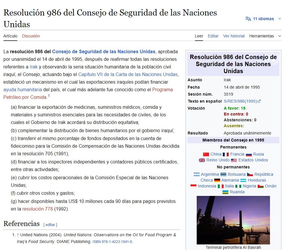 | 7 | Irak | Consejo de Seguridad de las Naciones Unidas | Resolución 986 | Resolución 986 del Consejo de Seguridad de las Naciones Unidas |