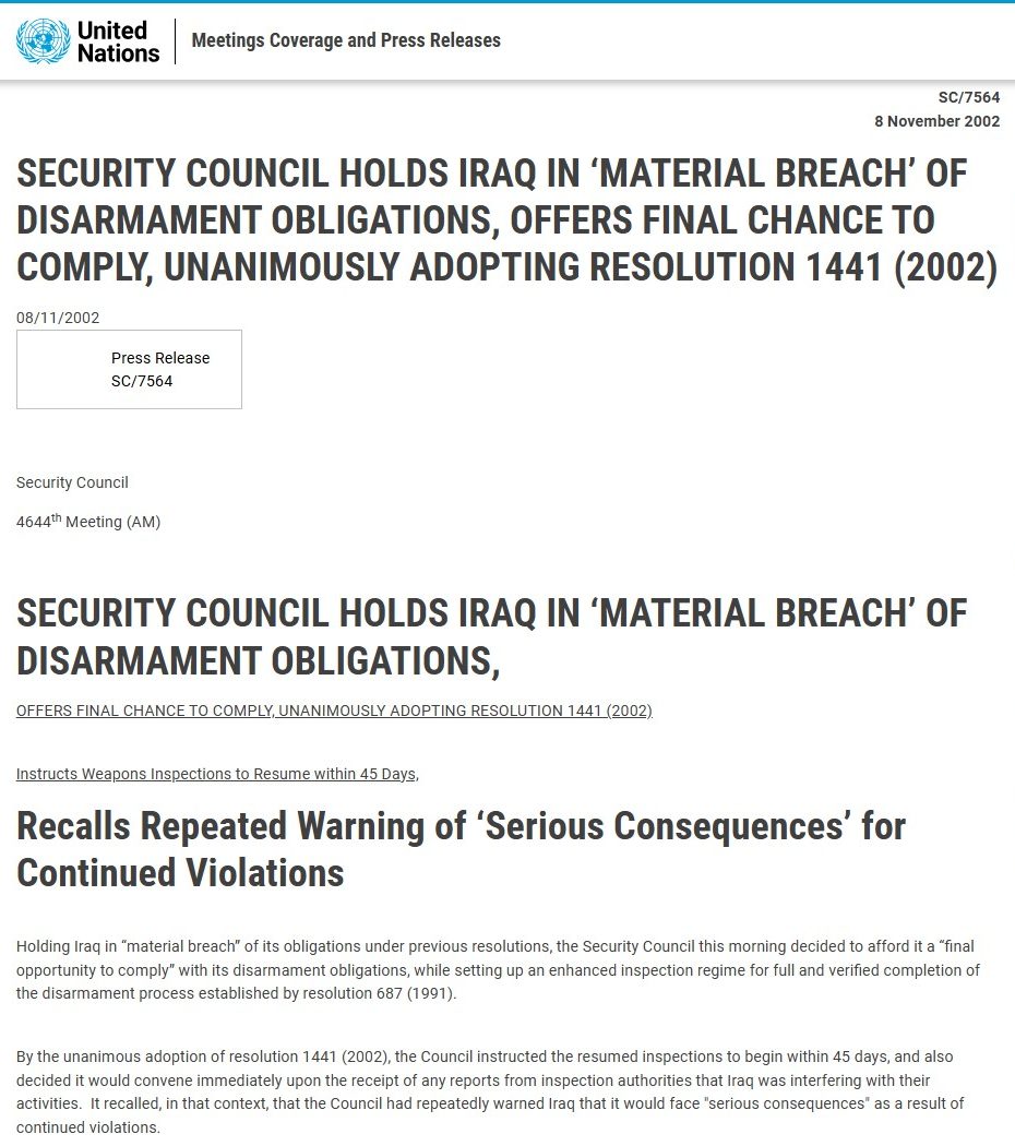 | 8 | Irak | Consejo de Seguridad de las Naciones Unidas | SECURITY COUNCIL HOLDS IRAQ IN ‘MATERIAL BREACH’ OF DISARMAMENT OBLIGATIONS, OFFERS FINAL CHANCE TO COMPLY, UNANIMOUSLY ADOPTING RESOLUTION 1441 (2002) | SECURITY COUNCIL HOLDS IRAQ IN ‘MATERIAL BREACH’ OF DISARMAMENT OBLIGATIONS, OFFERS FINAL CHANCE TO COMPLY, UNANIMOUSLY ADOPTING RESOLUTION 1441 (2002) |
