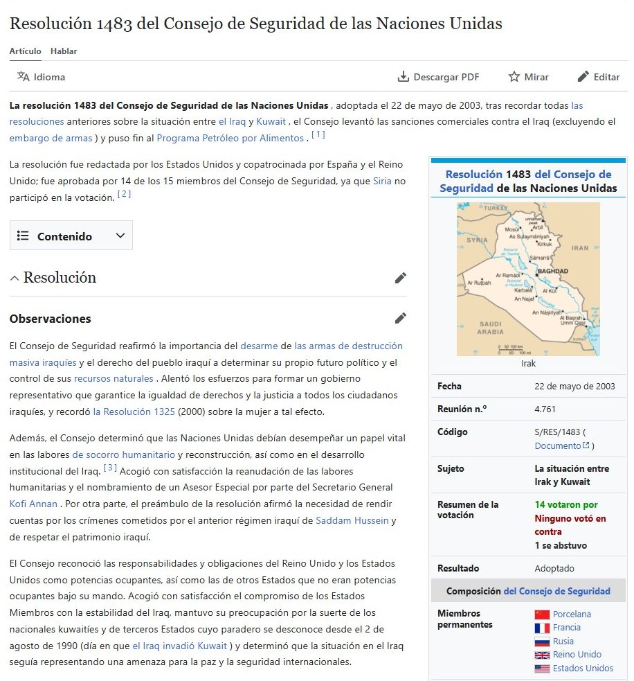 | 11 | Irak | Consejo de Seguridad de las Naciones Unidas | Resolución 1483 del Consejo de Seguridad de las Naciones Unidas | Resolución 1483 del Consejo de Seguridad de las Naciones Unidas |