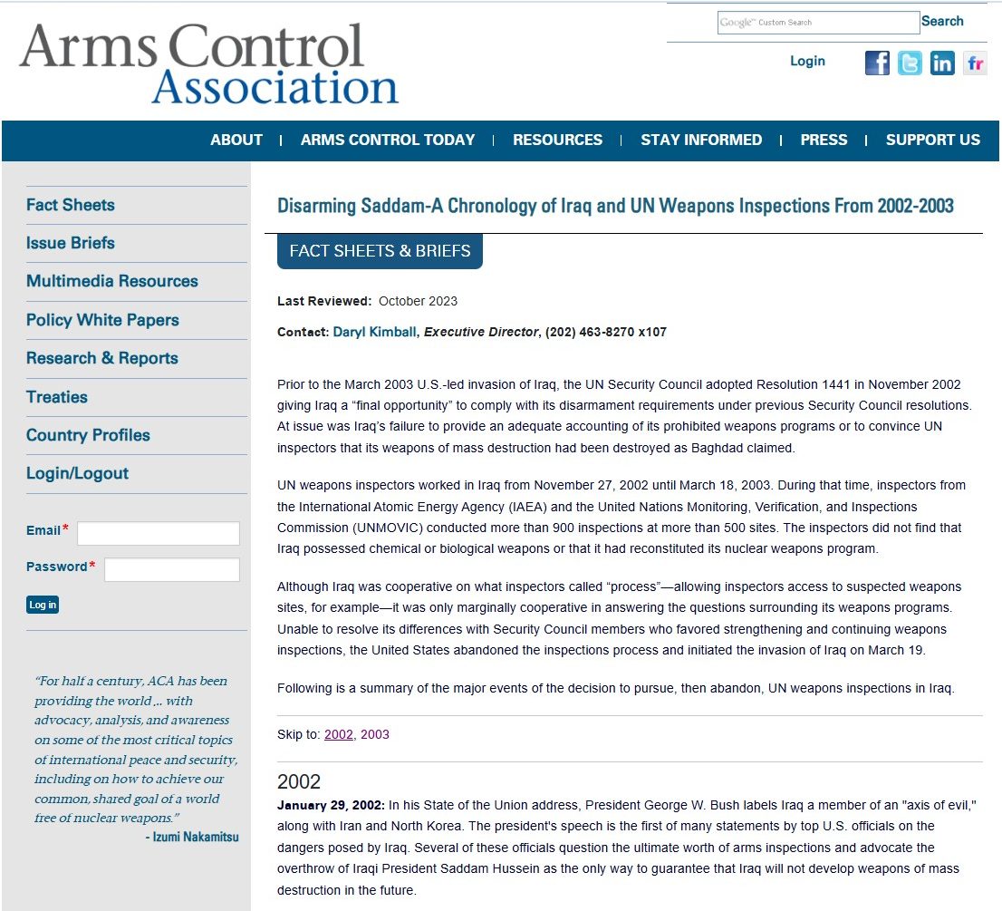 | 9 | Irak | Arms Control Association | Disarming Saddam-A Chronology of Iraq and UN Weapons Inspections From 2002-2003 | Disarming Saddam-A Chronology of Iraq and UN Weapons Inspections From 2002-2003 |