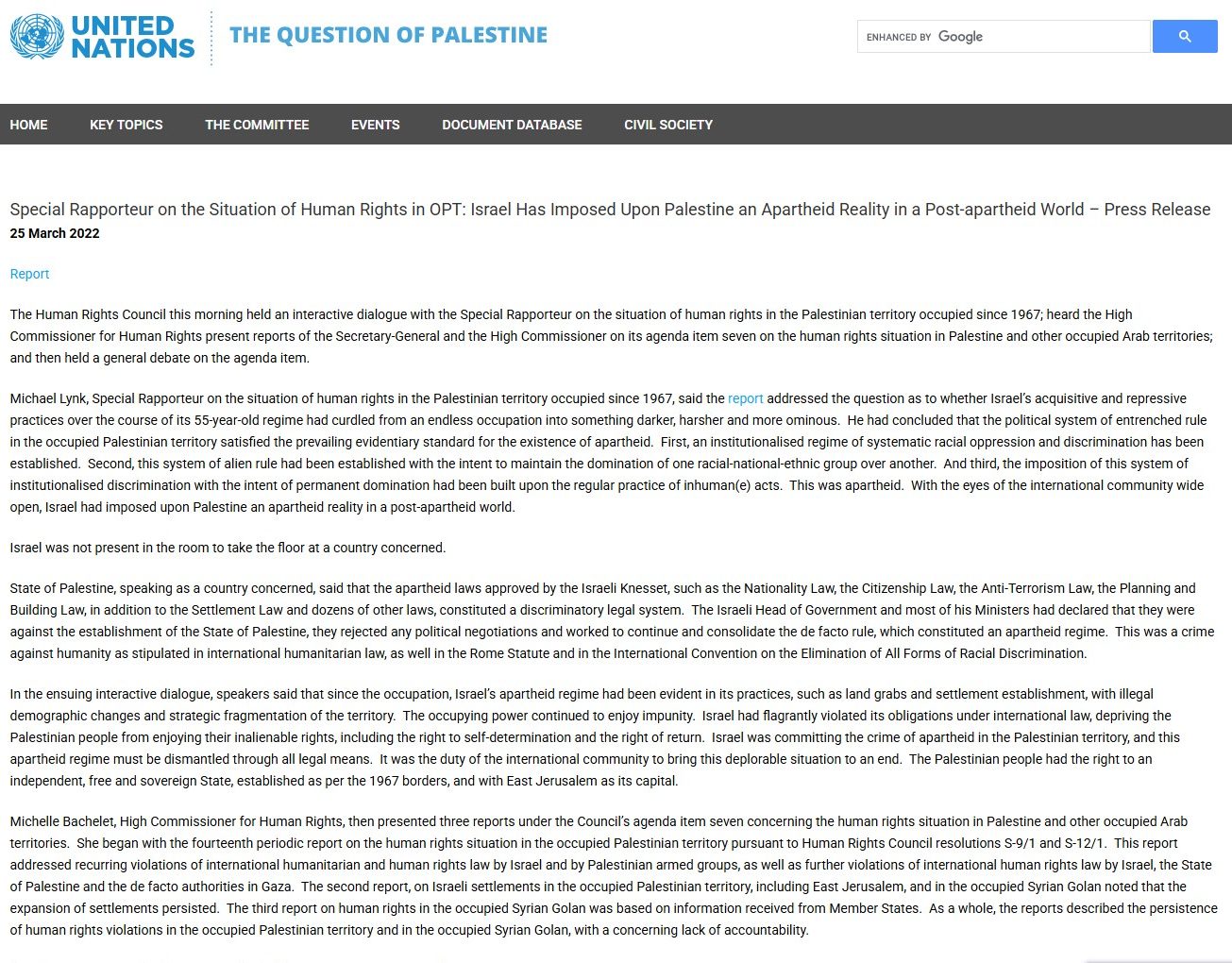 | 10 | ONU | Special Rapporteur on the Situation of Human Rights in OPT: Israel Has Imposed Upon Palestine an Apartheid Reality in a Post-apartheid World – Press Release | https://www.un.org/unispal/document/special-rapporteur-on-the-situation-of-human-rights-in-opt-israel-has-imposed-upon-palestine-an-apartheid-reality-in-a-post-apartheid-world-press-release/?ut |