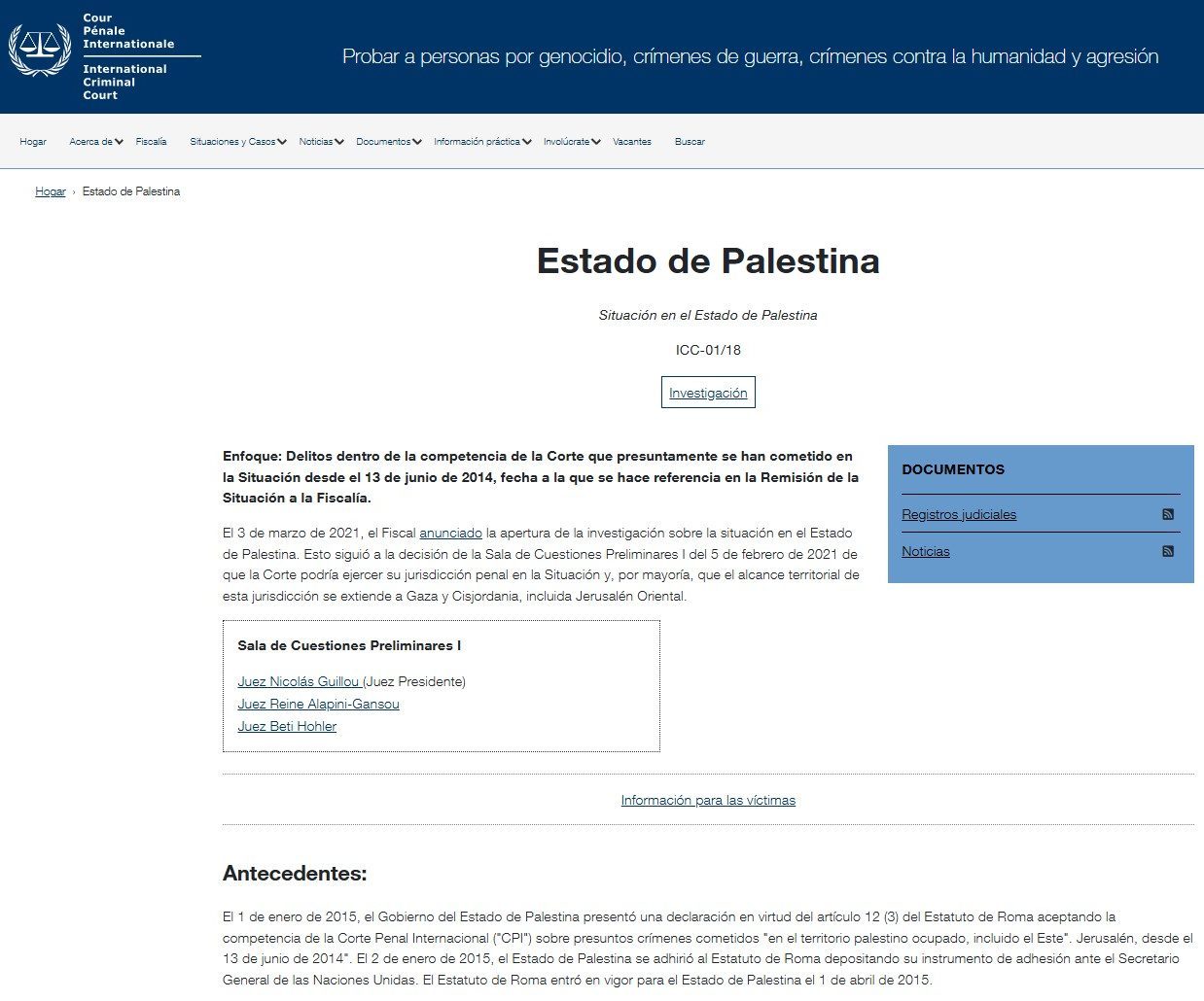 | 11 | Corte Penal Internacional – Estado de Palestina | Delitos dentro de la competencia de la Corte que presuntamente se han cometido en la Situación desde el 13 de junio de 2014, fecha a la que se hace referencia en la Remisión de la Situación a la Fiscalía. | https://www.icc-cpi.int/palestine |