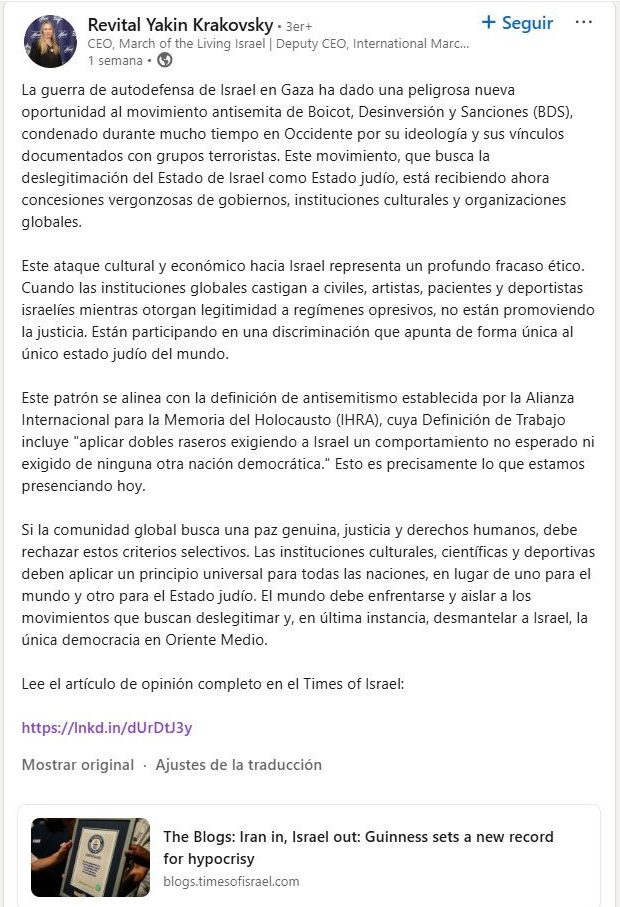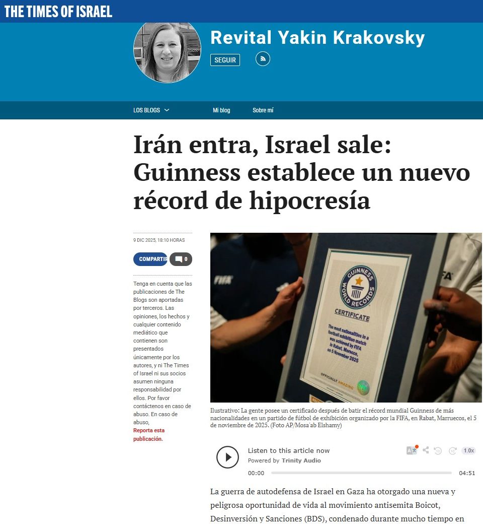 | 16 | THE TIMES OF IRSRAEL | Irán entra, Israel sale: Guinness establece un nuevo récord de hipocresía | https://blogs.timesofisrael.com/iran-in-israel-out-guinness-sets-a-new-record-for-hypocrisy/ |