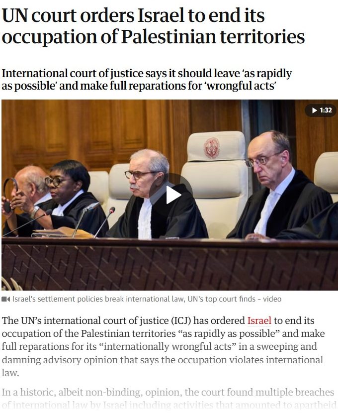 Guardian News 19 jul 2024 TRIBUNAL INTERNACIONAL DE JUSTICIA (CIJ) Las políticas de asentamientos de Israel violan el derecho internacional, concluye el máximo tribunal de la ONU.
