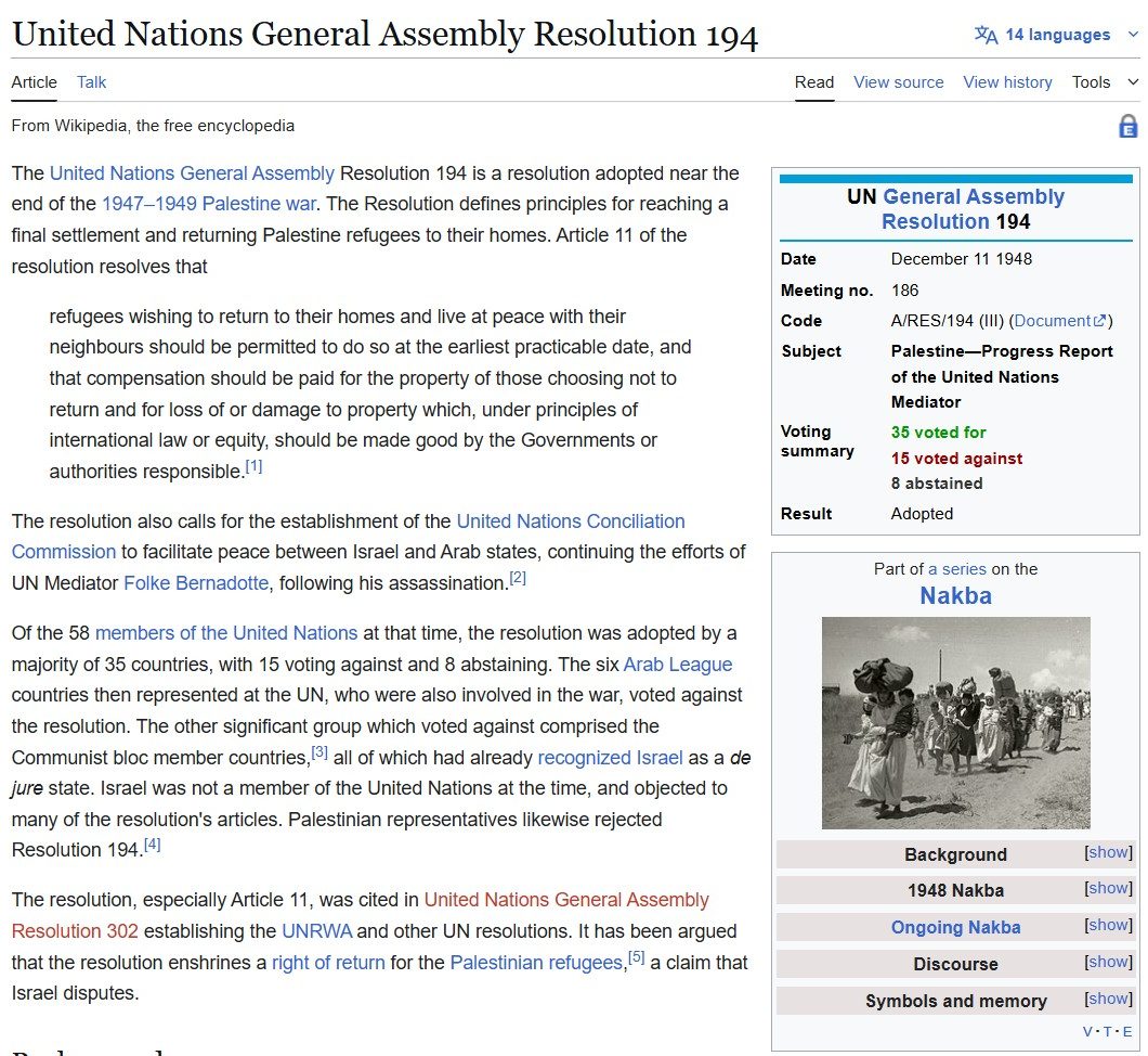 | 18 | WIKIPEDIA | United Nations General Assembly Resolution 194 | https://en.wikipedia.org/wiki/United_Nations_General_Assembly_Resolution_194?utm_source=chatgpt.com |