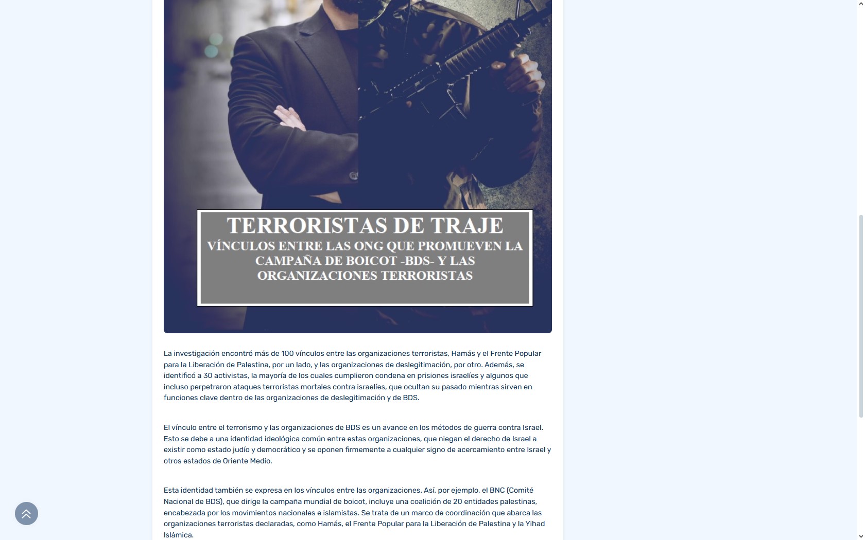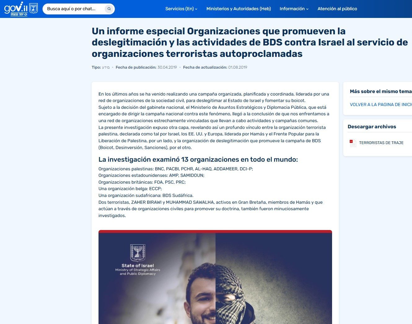 | 5 | Ministerio de Asuntos Estratégicos de Israel | Un informe especial Organizaciones que promueven la deslegitimación y las actividades de BDS contra Israel al servicio de organizaciones terroristas autoproclamadas | https://www.gov.il/es/pages/terrorists_in_suits |