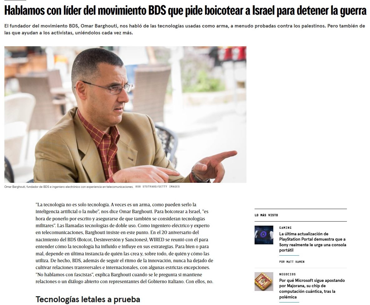 | 6 | WIRED | Hablamos con líder del movimiento BDS que pide boicotear a Israel para detener la guerra | https://es.wired.com/articulos/hablamos-con-lider-del-movimiento-bds-que-pide-boicotear-a-israel-para-detener-la-guerra |