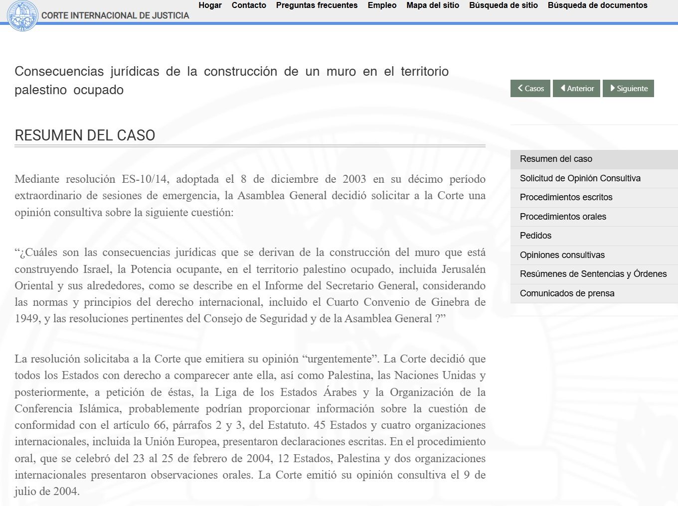 | 7 | Corte Internacional de Justicia | Consecuencias jurídicas de la construcción de un muro en el territorio palestino ocupado | https://www.icj-cij.org/case/131 |