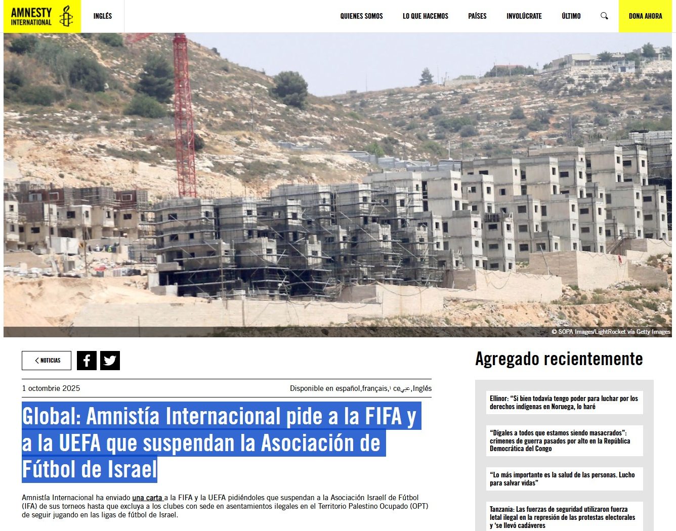 | 9 | Amnistía Internacional | Global: Amnistía Internacional pide a la FIFA y a la UEFA que suspendan la Asociación de Fútbol de Israel | https://www.amnesty.org/en/latest/news/2025/10/amnesty-fifa-uefa-suspend-israeli-football-association/?utm_source=chatgpt.com |