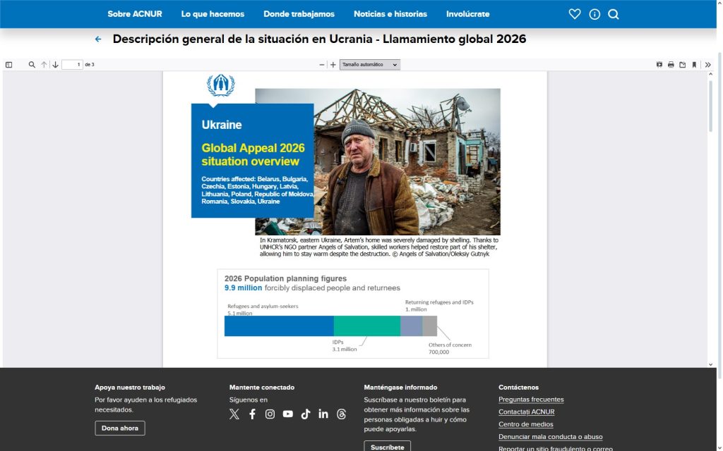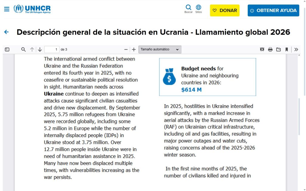 El conflicto armado entre Ucrania y la Federación de Rusia entró en su cuarto año en 2025, sin alto el fuego ni resolución política a la vista. Las necesidades humanitarias se han profundizado a medida que la intensificación de los ataques causa importantes víctimas civiles e impulsa nuevos desplazamientos. Para septiembre 2025, 5,75 millones se registraron refugiados de Ucrania en todo el mundo, incluidos 5,2 millones en Europa, mientras que 3,75 millones de personas seguían desplazadas internamente.
