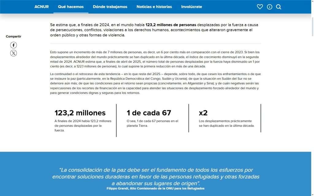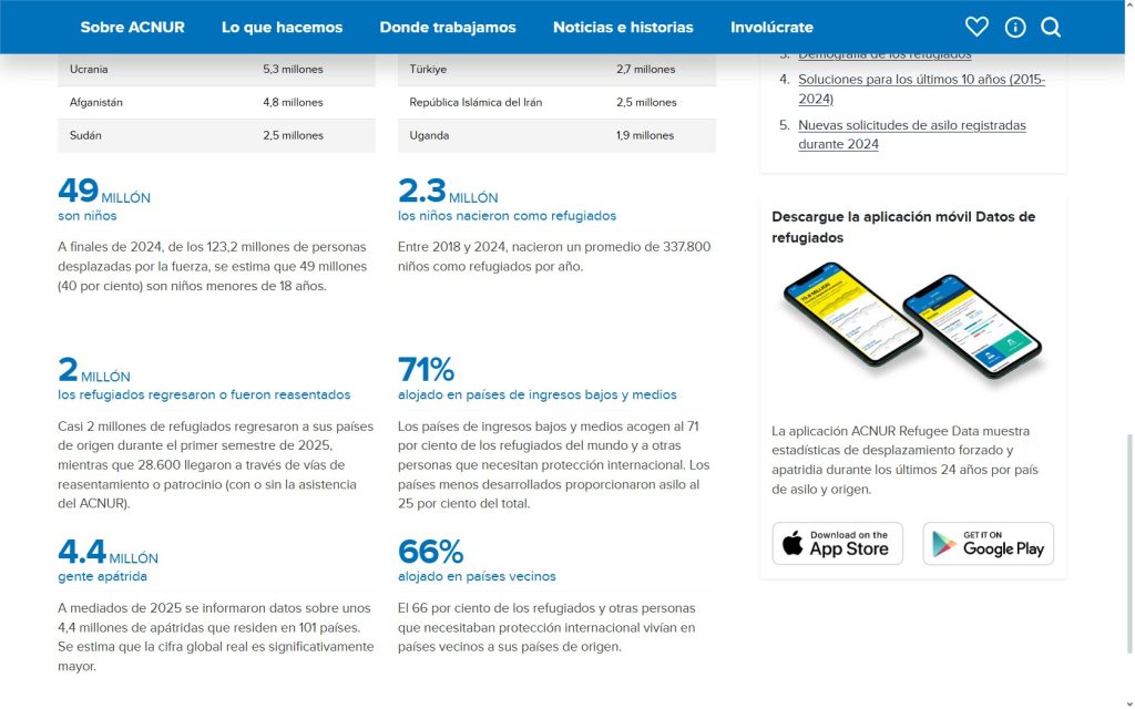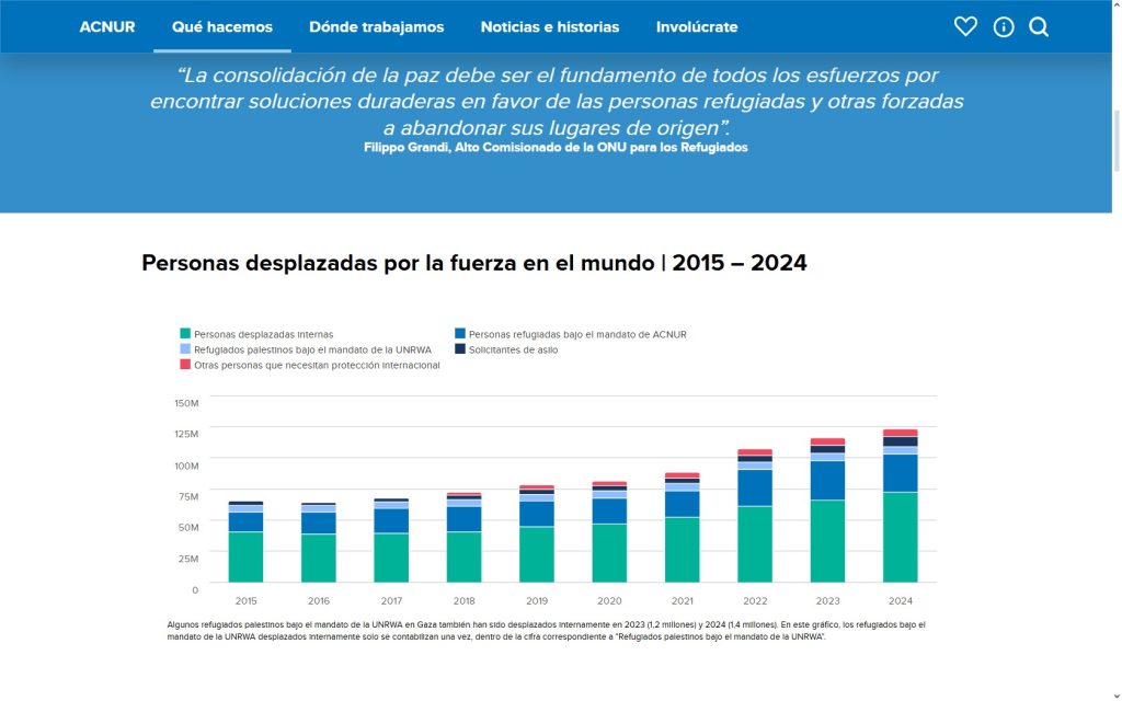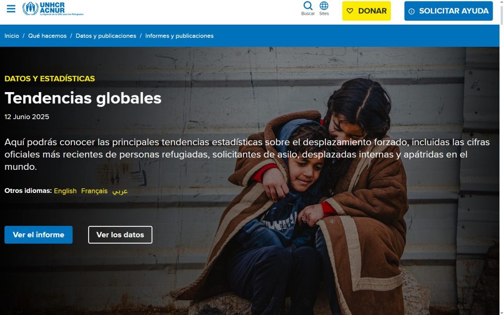 El informe Tendencias Globales de ACNUR presenta las principales tendencias estadísticas y los datos oficiales más recientes sobre personas refugiadas, solicitantes de asilo, desplazadas internas y apátridas a nivel mundial. A finales de 2024, en el mundo había 123,2 millones de personas desplazadas por la fuerza por causa de conflictos, violencia, persecución, violaciones de los derechos humanos y eventos que perturbaron gravemente el orden público.
