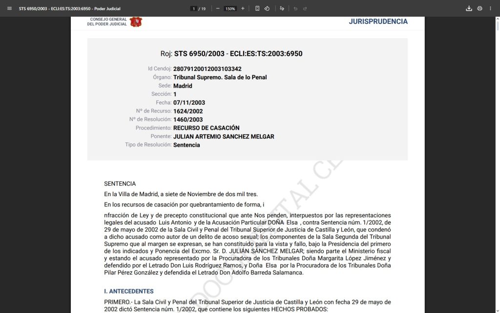 | 2 | Tribunal Supremo | Condena a Ismael Álvarez por acoso sexual 07 de noviembre del 2003 | Condena a Ismael Álvarez por acoso sexual |
