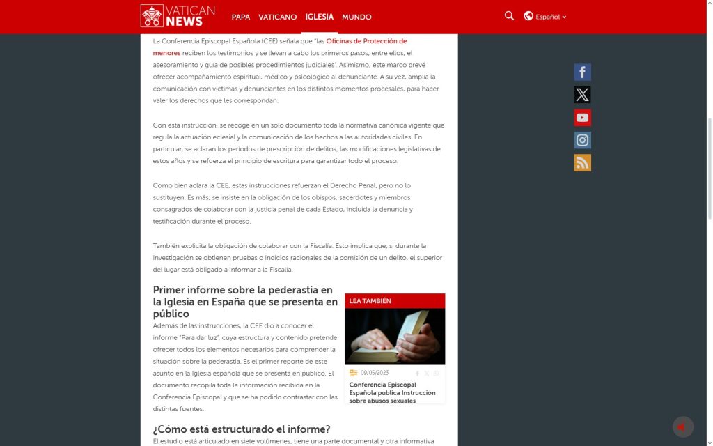Este posicionamiento queda formulado con claridad en la Instrucción de la Conferencia Episcopal Española sobre abusos sexuales (mayo de 2023), cuyo preámbulo afirma: