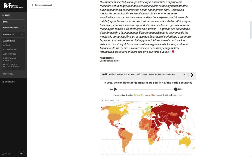 [7] Índice Mundial de Libertad de Prensa RSF 2025: la fragilidad económica es una de las principales amenazas a la libertad de prensa