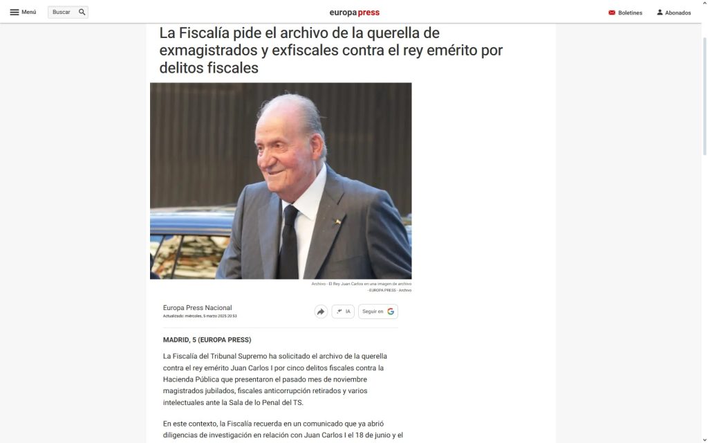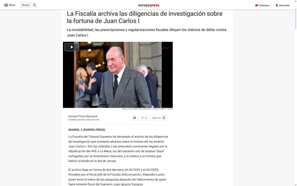 🔗 Fuente : Europa Press – La Fiscalía archiva las diligencias de investigación sobre la fortuna de Juan Carlos I (2 de marzo de 2022).