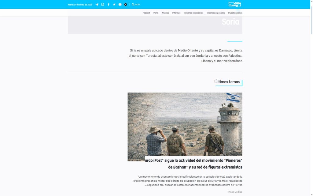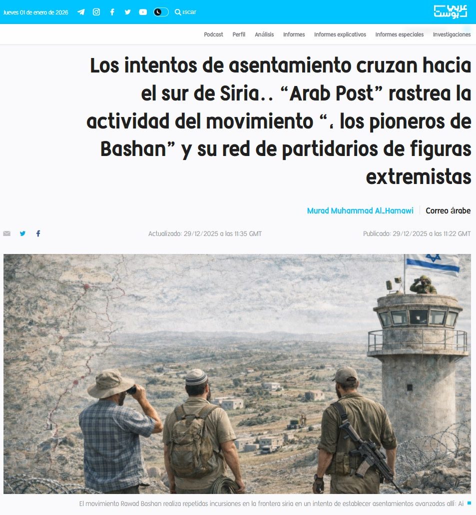 | [1] | Arabicpost | 29/12/2025 | Investigación original sobre colonización en el sur de Siria | Arabicpost – Investigación |