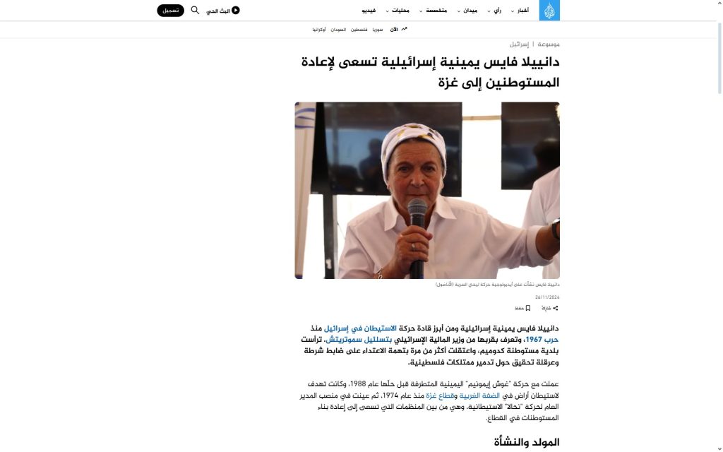 | [14] | AlJazeera Arabic | s.f. | Daniela Weiss es una israelí de derecha que busca devolver colonos a Gaza | Nahala |