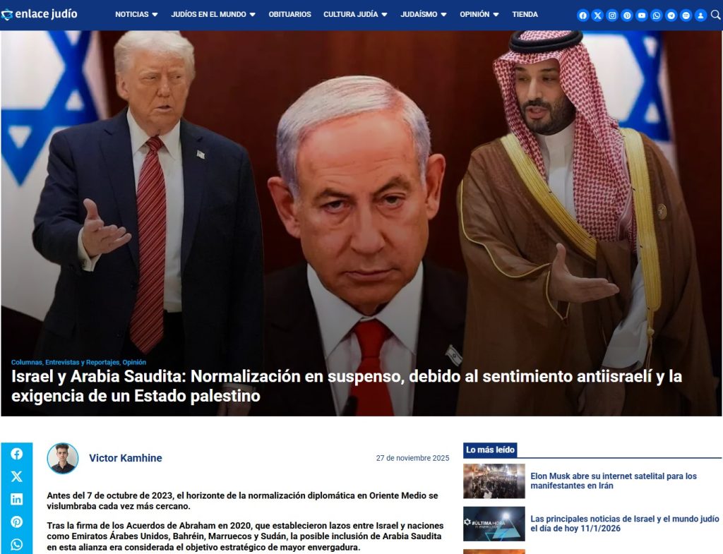 [17] 27 de noviembre 2025enlace judíoIsrael y Arabia Saudita: Normalización en suspenso, debido al sentimiento antiisraelí y la exigencia de un Estado palestino