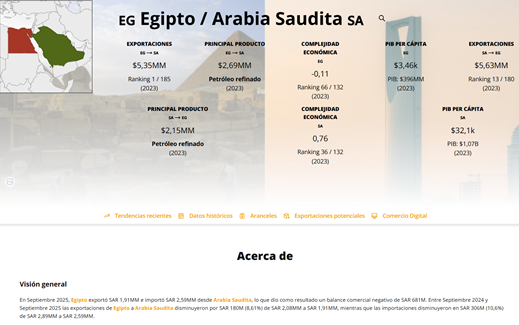 [13] 17/12/2025 – Observatory of Economic Complexity (MIT)«Comercio entre Egipto (EGY) y Arabia Saudita (SAU)» (datos actualizados a noviembre 2025). Base de datos interactiva con cifras de exportaciones. Disponible en: https://oec.world/es/profile/bilateral-country/egy/partner/sau
