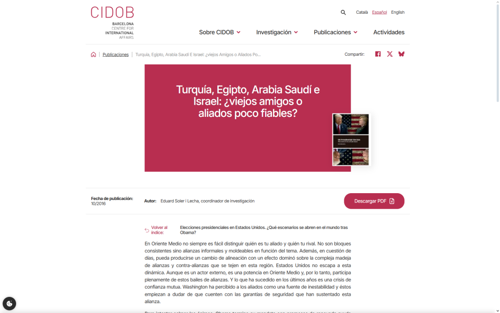 2CIDOB (Barcelona Centre for International Affairs)25/11/2024Turquía, Egipto, Arabia Saudí e Israel: ¿viejos amigos o aliados poco fiableshttps://www.cidob.org/publicaciones/turquia-egipto-arabia-saudi-israel-viejos-amigos-aliados-poco-fiables