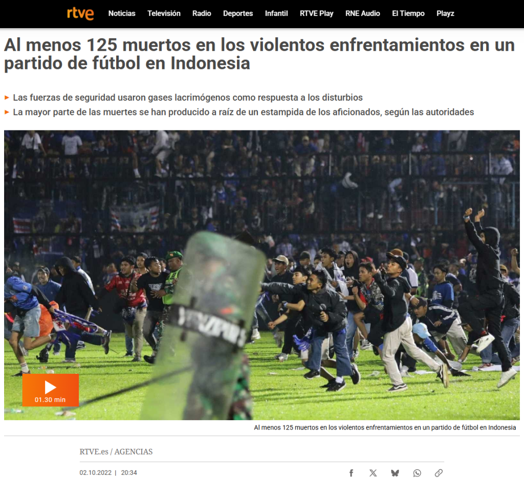 [8] 02 de octubre de 2022 – rtve – Al menos 125 muertos en los violentos enfrentamientos en un partido de fútbol en Indonesia