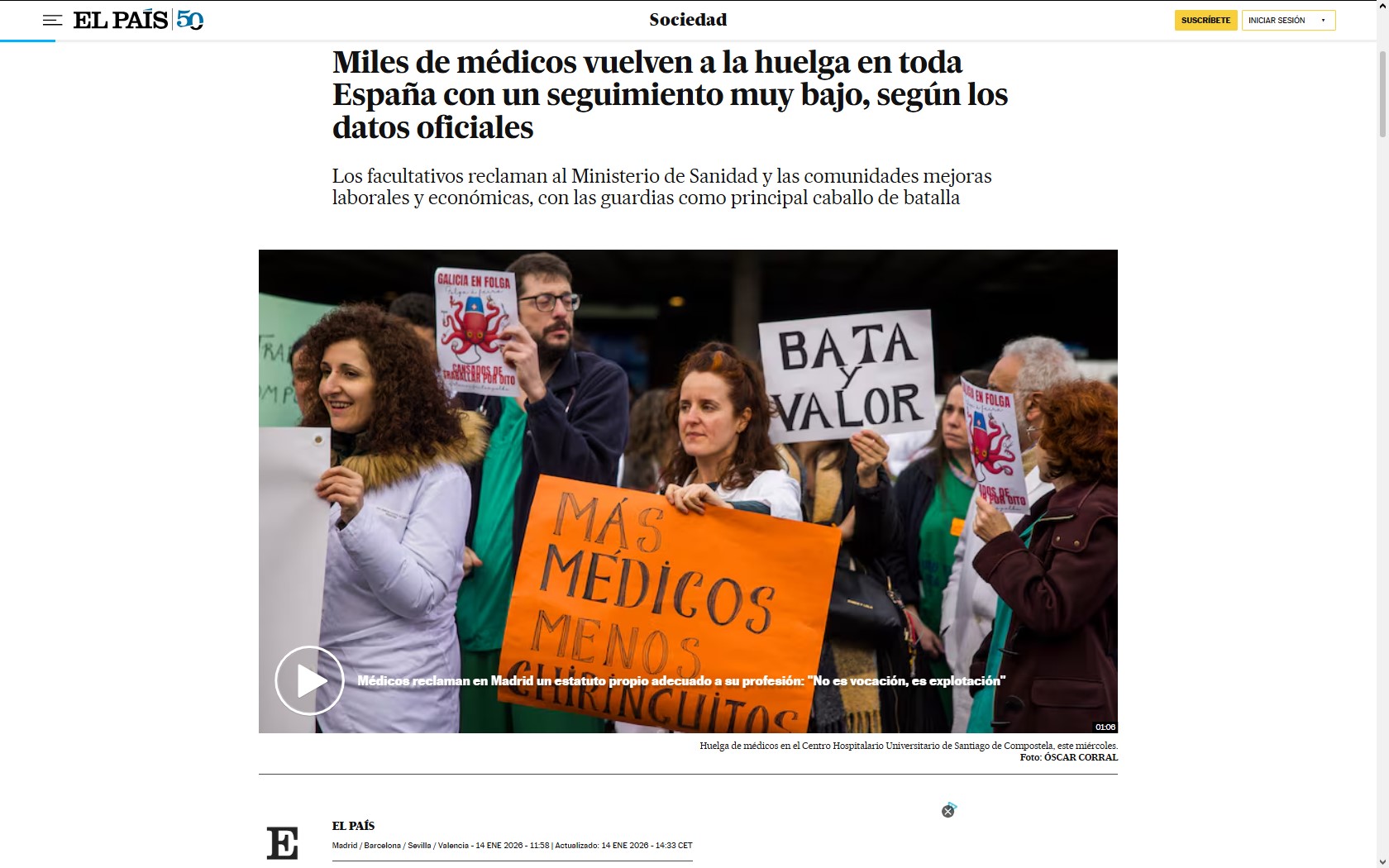 [8] 14 de enero de 2026EL PAÍSMiles de médicos vuelven a la huelga en toda España con un seguimiento muy bajo, según los datos oficiales