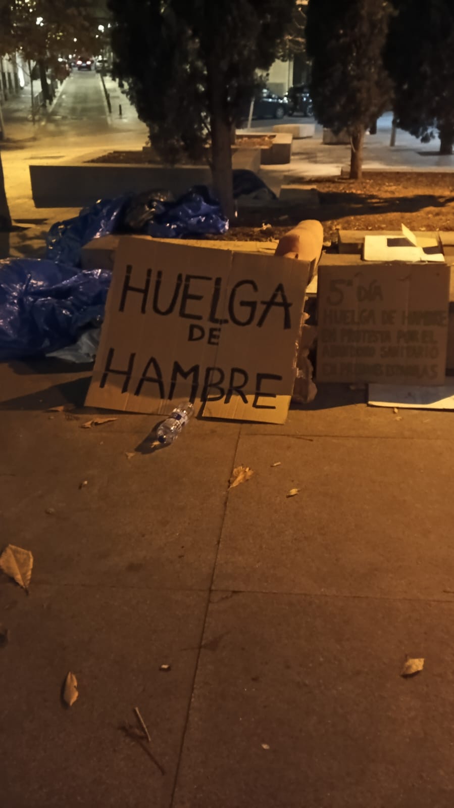 • Pope: Teníamos lo mínimo […] y nada, todo eso les dio igual. Me lo quitaron todo. Porque las pancartas se veía mucho lo que estábamos denunciando y eso no les interesó que se viera tanto. […] Esa noche… me sentía… al día siguiente me sentía como un fideo en el agua, ¿sabes? Porque me cayó una encima… tremenda. […] Y bueno, lo bueno es que… no sé, pero yo a pesar de que ponía allí un cartel muy grande que ponía «HUELGA DE HAMBRE» en negro […] todo el mundo venía a traerme comida. […] Menos mal que yo ya había cerrado el chip de la comida, ni pensaba en la comida.