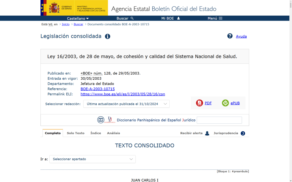 [1] 29/05/2003Agencia EstatalBoletín Oficial del Estado (BOE) – Ley 16/2003, de 28 de mayo, de cohesión y calidad del Sistema Nacional de Salud.