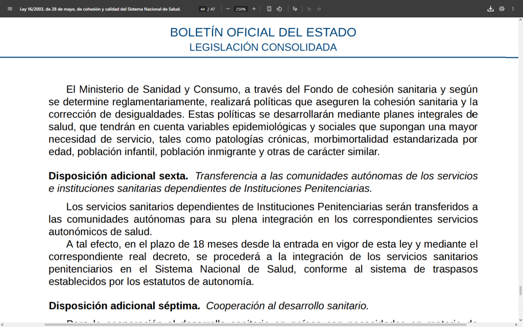 La disposición adicional sexta (página 44) de la Ley 16/2003 de Cohesión y Calidad del Sistema Nacional de Salud (SNS) establece la transferencia de los servicios sanitarios de Instituciones Penitenciarias a las Comunidades Autónomas (CCAA). Este proceso busca integrar la sanidad penitenciaria en los sistemas de salud autonómicos para garantizar la igualdad de prestaciones de los internos