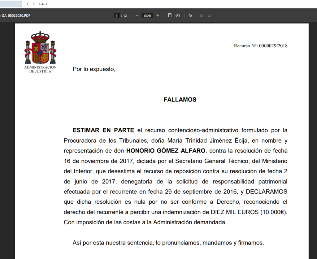 En su parte dispositiva final, el tribunal no solo ordena la indemnización, sino que «tumba» legalmente la decisión del Ministerio del Interior de 2017 que se negaba a pagar, confirmando que la administración actuó ilegalmente al negar su responsabilidad: