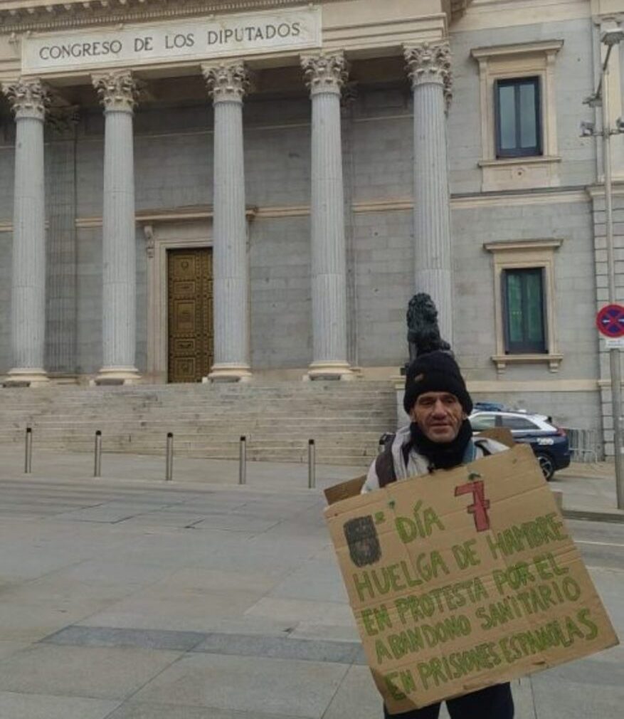 • Desde el 20 de diciembre de 2025, desarrolla una huelga de hambre en la Plaza de las Cortes, frente al Congreso de los Diputados, contra el abandono sanitario en las prisiones.​