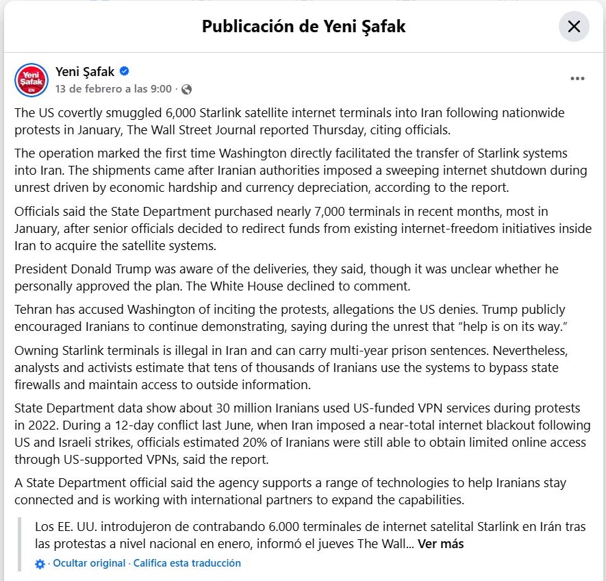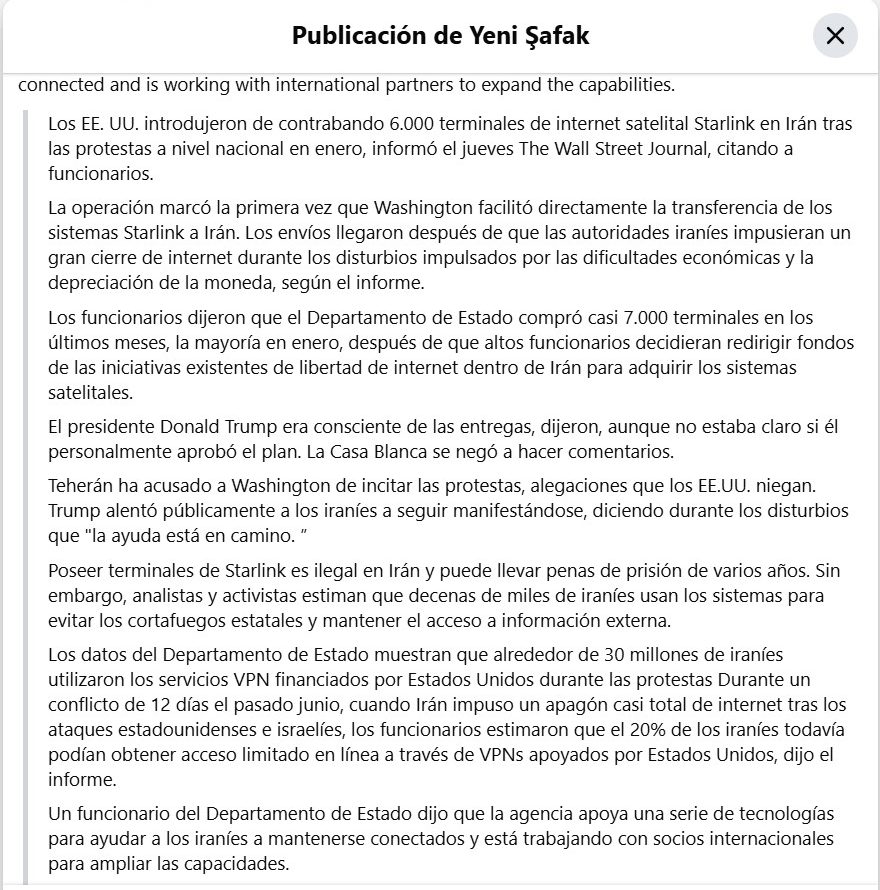 La fuente [10] corresponde a una publicación realizada por Yeni Şafak English en la plataforma Facebook, en la que se afirma que Estados Unidos introdujo de forma encubierta aproximadamente 6.000 terminales de internet satelital Starlink en Irán durante las protestas nacionales.