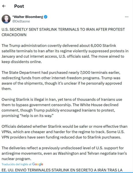 The Journal informa ahora que, tras la represión violenta, que presuntamente incluyó la muerte de miles de manifestantes, y en medio de restricciones continuadas de Internet, la administración Trump introdujo clandestinamente alrededor de 6.000 terminales Starlink en Irán para sostener la actividad de la oposición contra el régimen de los ayatolás.