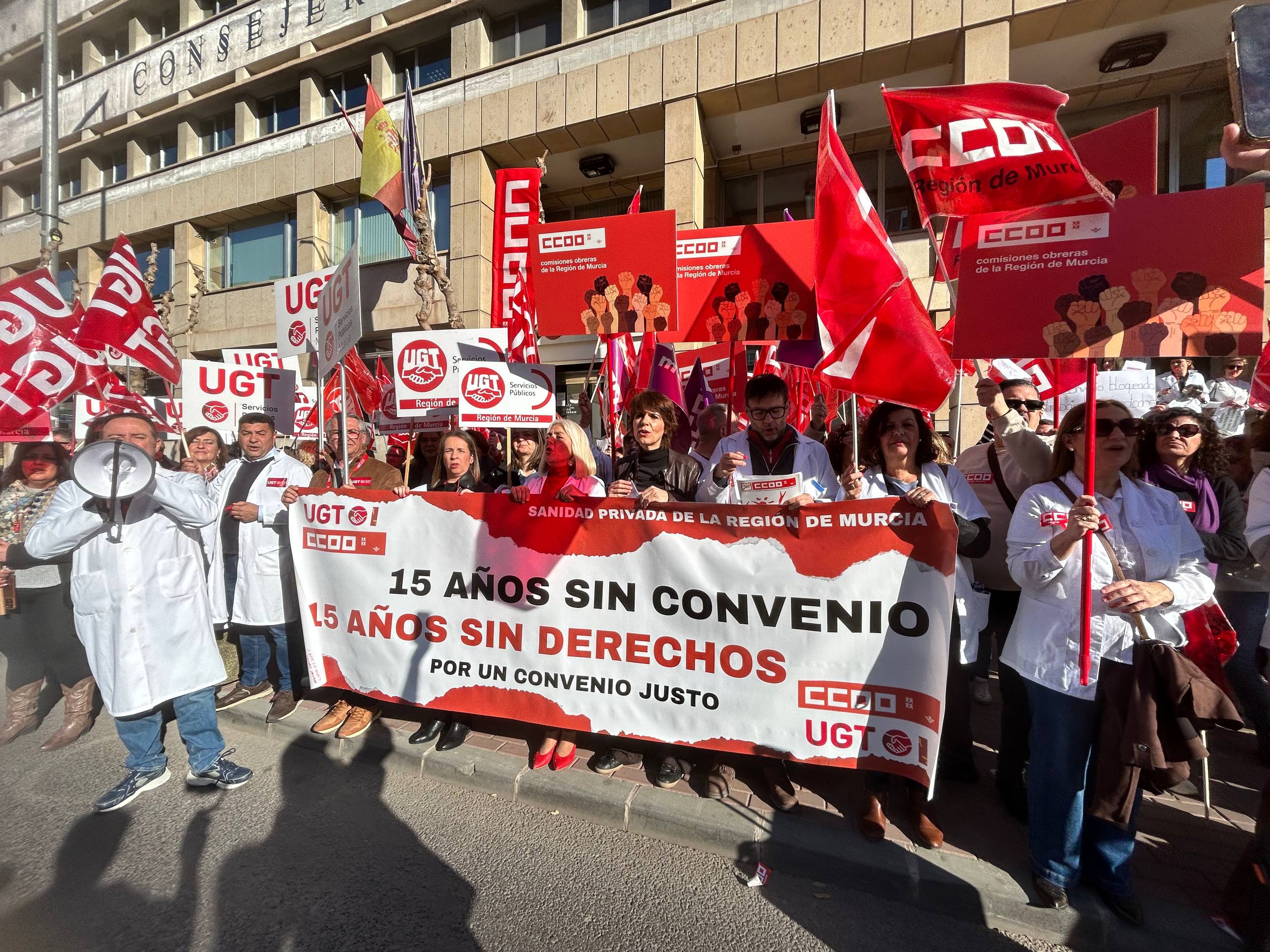 Los sindicatos CCOO y UGT se han movilizado hoy frente a la Consejería de Sanidad de la Región de Murcia para denunciar la precarización estructural que sufren cerca de 7.000 profesionales de la sanidad privada en la Región de Murcia, atrapados en un convenio colectivo caducado desde hace más de 15 años y bloqueado por la patronal del sector.
